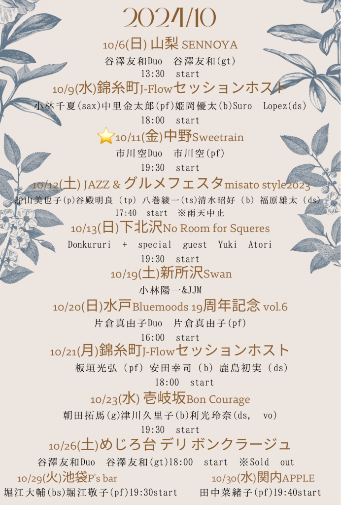 3/15(日) @喫茶去けやき(①12:00〜13:00②14:00〜/15:00)/ @デリボンクラージュ(17:00〜18:00)